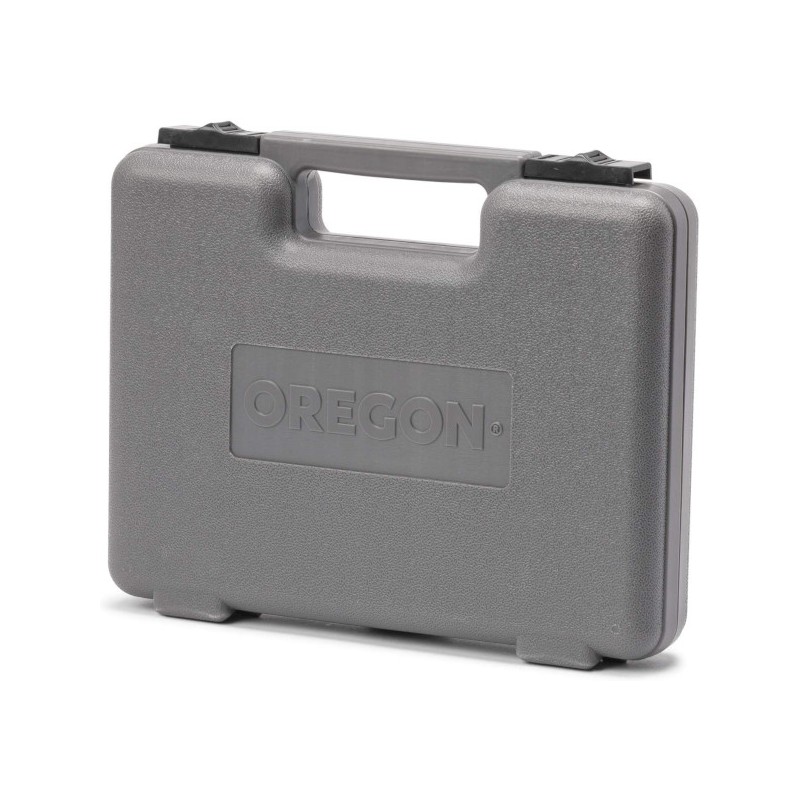Prémiová súprava na údržbu reťazovej píly Oregon v plastovom kufríku obsahuje: okrúhle pilníky, plochý pilník, rukoväte pilníkov, obmedzovač pätiek, plastový merací prístroj, prípravok na ostrenie, klin na sekanie, kľúč a skrutkovač.