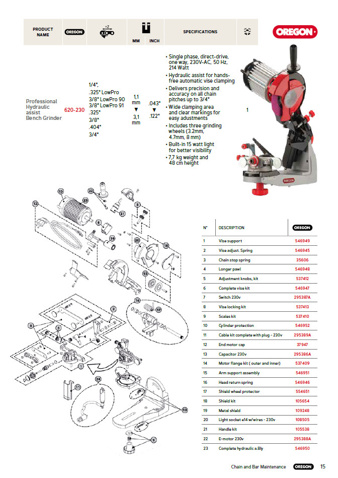 Táto brúska / ostřička OREGON s hydraulickým upínaním je určená na brúsenie všetkých rozstupov reťazí elektrických, motorových aj akumulátorových píľ v servisoch a špecializovaných predajniach. Brúska Oregon je obľúbená aj u hobby používateľov píľ, ktorí chcú mať reťaze precízne nabrúsené. Je vhodná aj na brúsenie harvestorových reťazí.