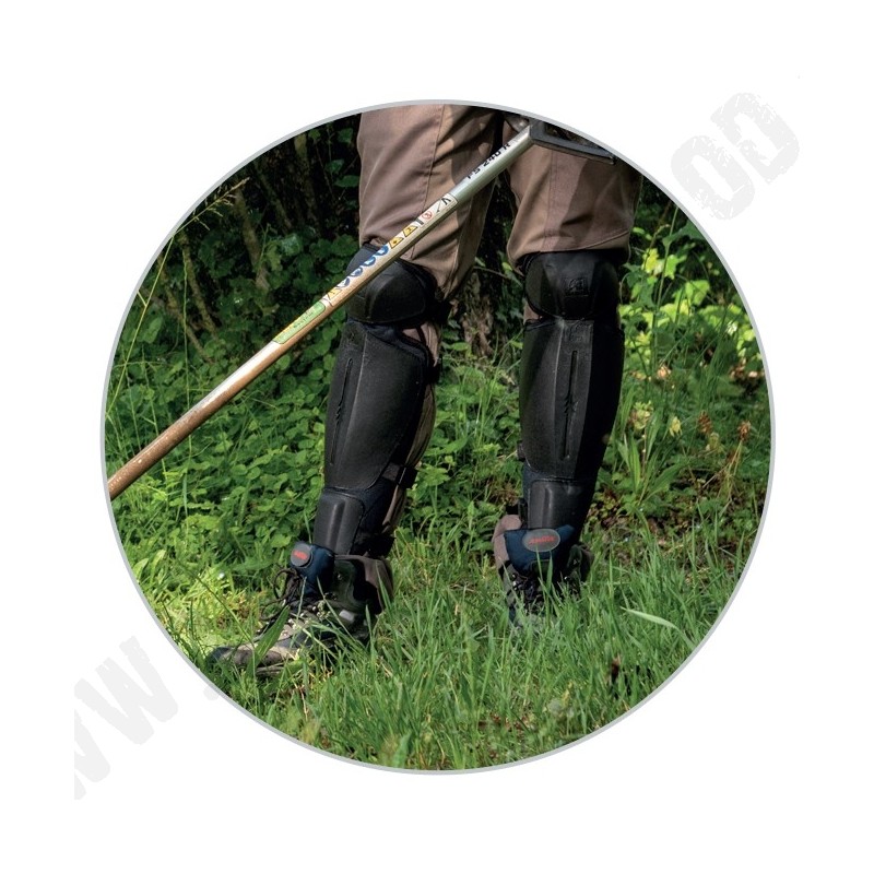 Chrániče holení na prácu s krovinorezom (1 pár). Chránia celú dolnú časť nohy a koleno. Vo vnútri mäkké, polstrované výplne. Dobre nastaviteľný systém s prackami.