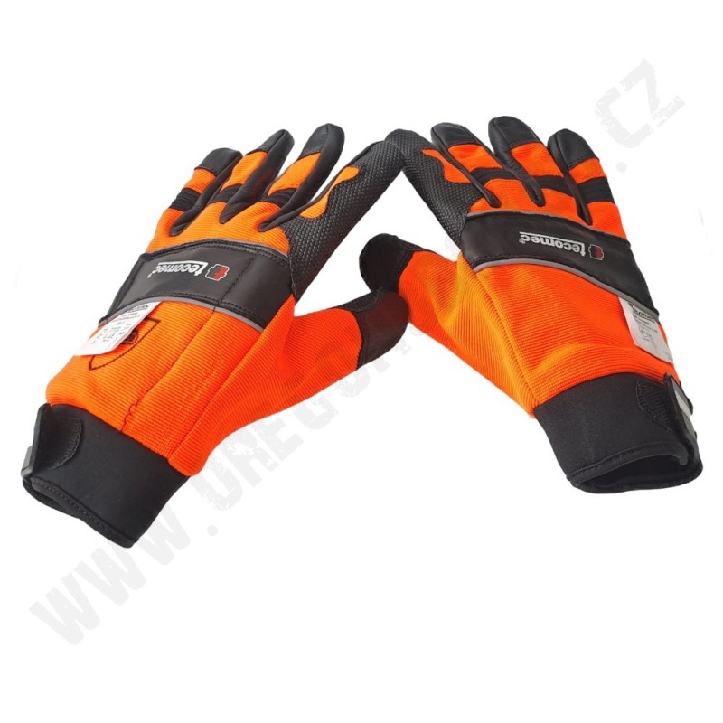 Čierno-oranžové rukavice TECOMEC z kože a spandexovej tkaniny určené na prácu s motorovou pílou.