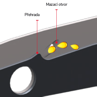Naša "priehrada" LubriTech na vodiacej lište je veľmi dômyselne navrhnutá tak, aby udržala mazivo tam, kde je najviac potrebné. Vyzerá ako malý prah a nachádza sa v spodnej časti drážky vodiacej lišty, hneď za mazacím otvorom. Zlepšuje prístupnosť oleja a znižuje upchávanie mazacieho otvoru. Výsledkom je celkovo lepšie mazanie. Šikmý tvar mazacieho otvoru LubriTech zabraňuje upchávaniu mazacieho otvoru vodiacej lišty. Mazací otvor sa skláňa smerom nahor k okraju vodiacej lišty a dopredu k hornej časti lišty. Jeho priemer je približne o 40 % menší ako priemer bežných mazacích otvorov, čo má za následok zvýšenie rýchlosti pri vstupe oleja do vodiacej lišty. To tiež pomáha odstraňovať piliny a iné nečistoty z mazacieho otvoru počas rezania.