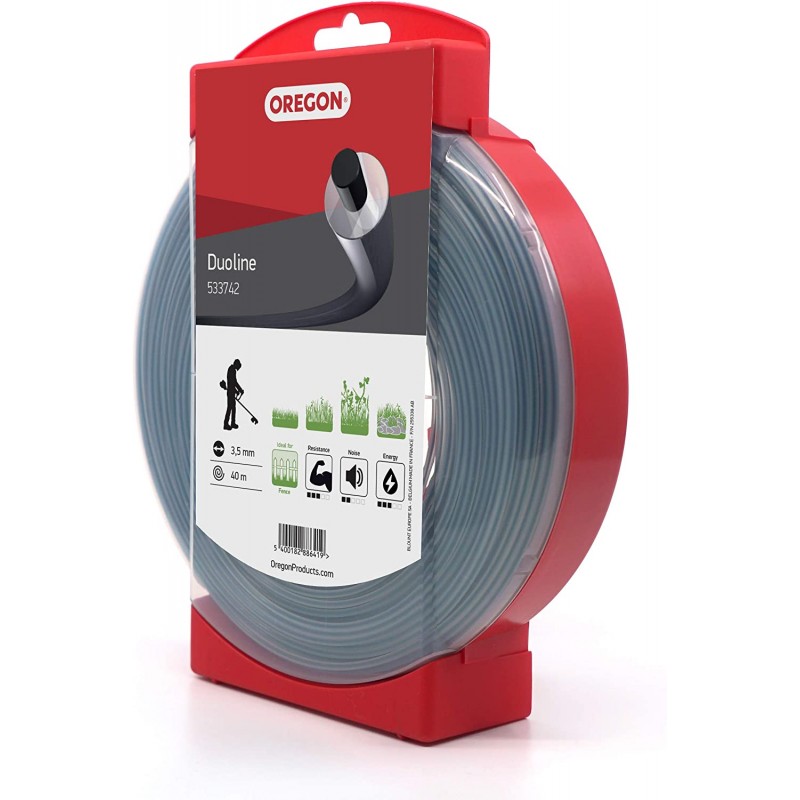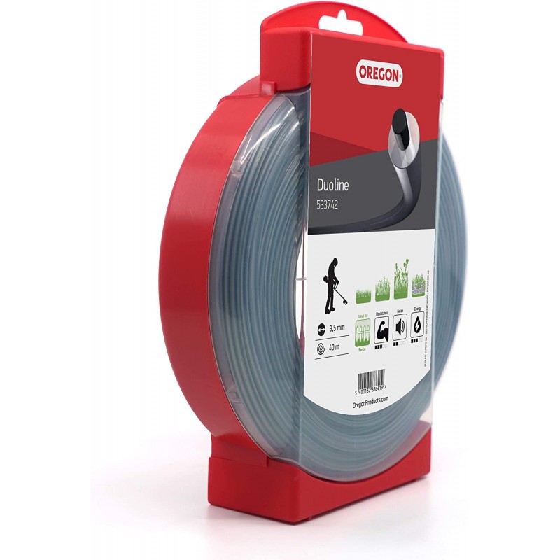 Zloženie struny Oregon Duoline - 30 % odolného, pevného uhlíkového jadra a 70 % pružnejšieho vonkajšieho plášťa - umožňuje ľahšiu absorpciu nárazov a znižuje riziko zachytenia struny v očku zacej hlavy